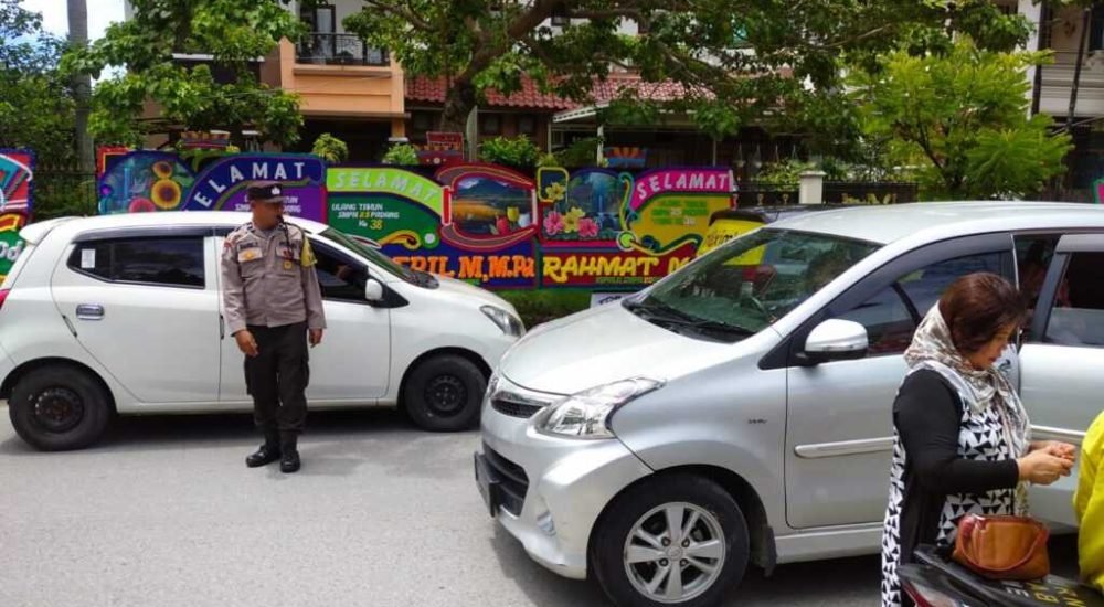 Seperti pada puncak HUT SMPN 25, Senin (29/10), Aipda Hasbi sibuk mengatur lalu lintas didepan SMPN 25 yang macet akibat banyaknya kendaraan yang lalu lalang.
