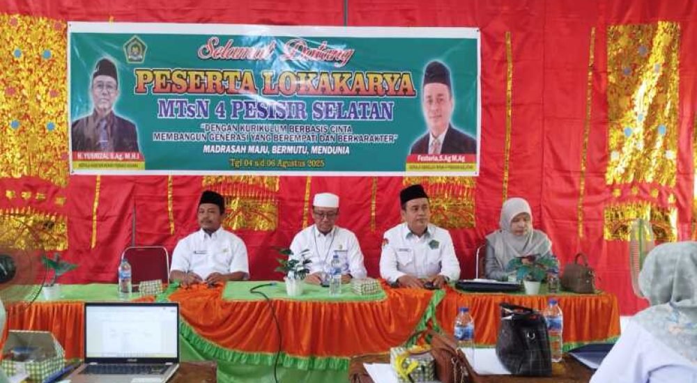 Tarusan, Sumbarinfo.com – Dalam upaya membangun generasi yang Berempati dan Berkarakter, Madrasah Maju, Bermutu dan Mendunia MTsN 4 Pesisir Selatan gelar lokakarya dengan Tema ” Dengan Kurikulum Berbasis Cinta Membangun Generasi yang Berempati dan Berkarakter tanggal” (4-6/8/25).