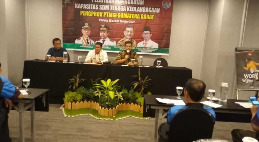Padang, SumbarInfo,- Mengupgrade pekerjaan sangat penting dilakukan agar tidak ketinggalan dalam hal hal yang baru. Pernyataan ini disampaikan Kadispora Provinsi Sumatera Barat Dedi Diantolani saat menyampaikan arahannya ketika membuka Pelatihan Peningkatan Kapasitas SDM Tenaga Keolahragaan kerjasama Dispora Sumbar dengan PTMSI Sumbar di Hotel Ibiz Padang, 28-30 Oktober 2022.