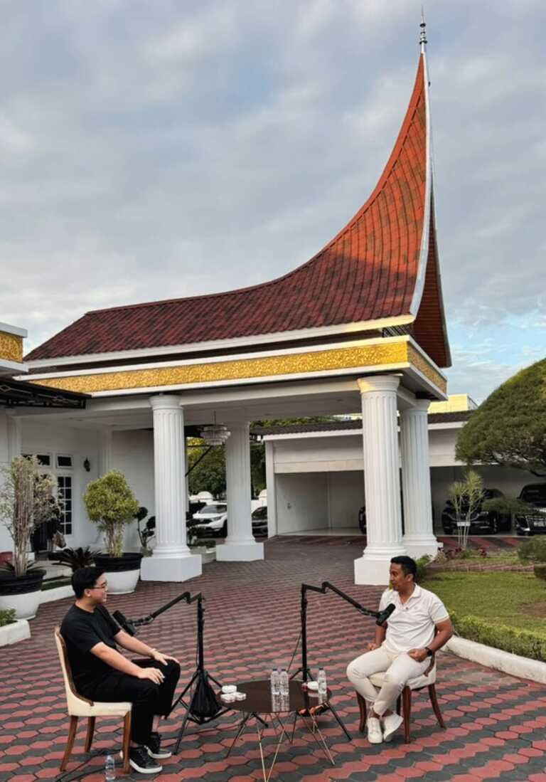 Wakil Gubernur Sumatera Barat (Wagub Sumbar) Vasko Ruseimy, menunjukkan kebanggaannya terhadap arsitektur tradisional Minangkabau kepada Timothy Ronald, seorang pengusaha muda yang dikenal luas di media sosial sebagai triliuner muda dan dijuluki Raja Crypto Indonesia”.