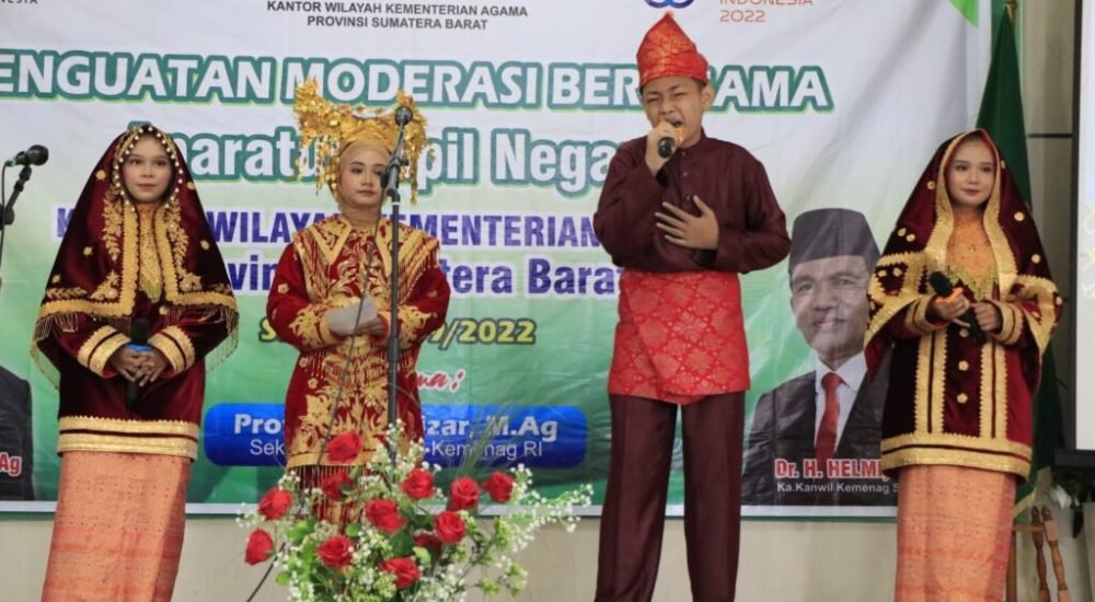 Padang, Sumbarinfo.com- Tim Musikalisasi Puisi Moderasi Beragama Madrasah Tsanawiyah Negeri (MTsN) 1 Kota Padang kembali tampil diajang bergengsih tingkat Provinsi Sumatera Barat. Kali ini tampil didepan Sekretaris Jenderal (Sekjen) Kementerian Agama RI pada acara Penguatan Moderasi Beragama Aparatur Sipil Negara dilingkungan Kanwil Kemenag Sumbar, bertempat di aula Amal Bakti 1kanwil setempat, Sabtu (17/09/22).
